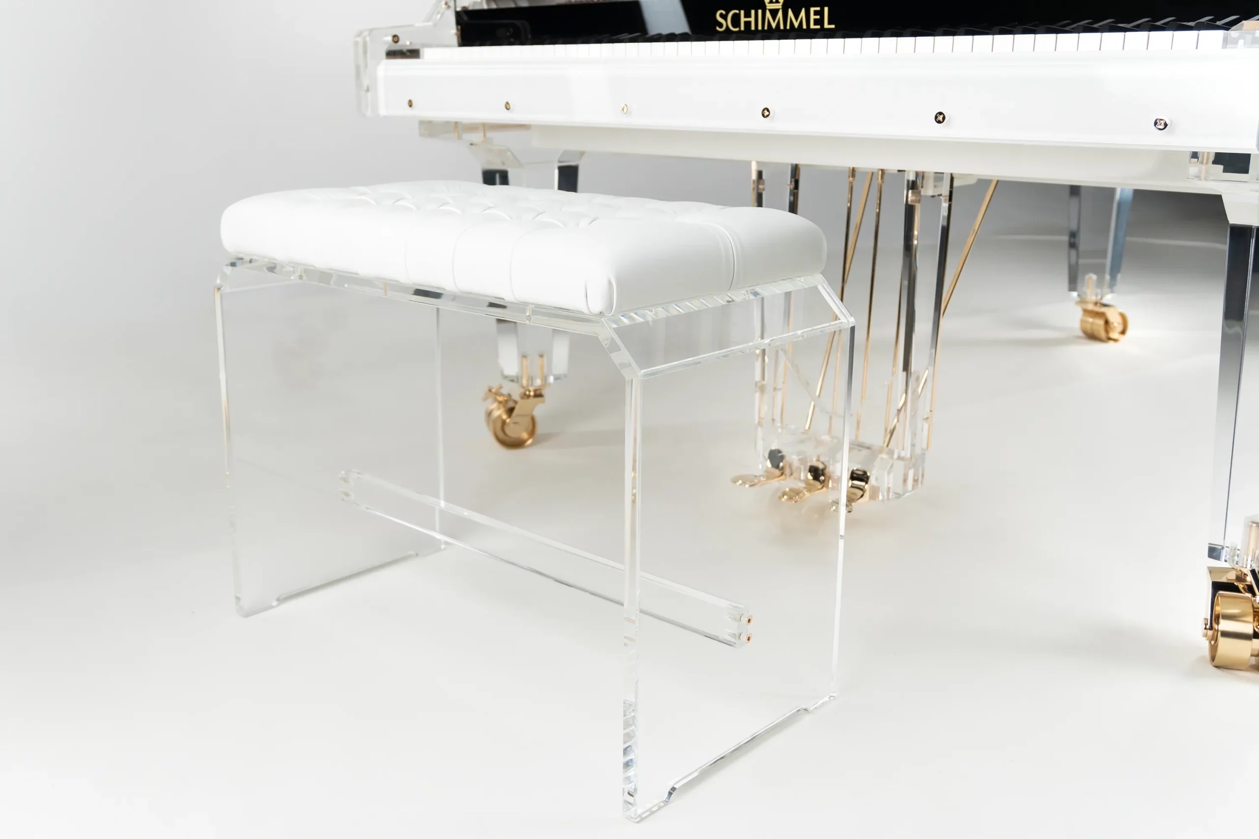 1951年,Schimmel首次創造性地研制出“水晶”鋼琴,全透明的外殼設計使得三角鋼琴的每一個內部構造都能被精美地呈現出來,設計歷久常新,至今仍然是業界的典范。 水晶鋼琴是完美藝術、工藝和音色的結合。突破了造琴的傳統,采用了嶄新材料及工藝大師合力制成,超過12,000個組件,其音色可媲美任何演奏級三角鋼琴。水晶鋼琴的零件都鍍上真金,是普通鋼琴的兩倍重量, 耐用堅固。內置LED可調校燈光系統,演奏時鋼琴宛如水晶般晶瑩剔透,折射出色彩繽紛的舞臺燈光。