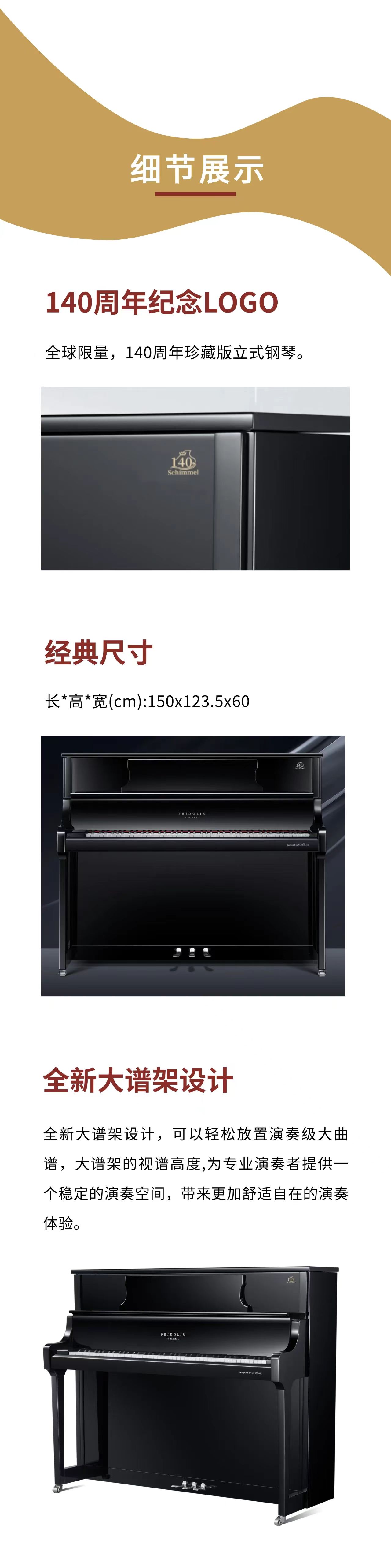 F123special edition外觀高端大氣,琴身沉穩厚重,彰顯專業演奏之本色。大譜架和一體式三角鋼琴鍵蓋設計,呈現高貴優雅的三角鋼琴曲線,獲得更加舒適自在的視譜和演奏體驗,讓您專注于演奏,探索音樂的精彩。
